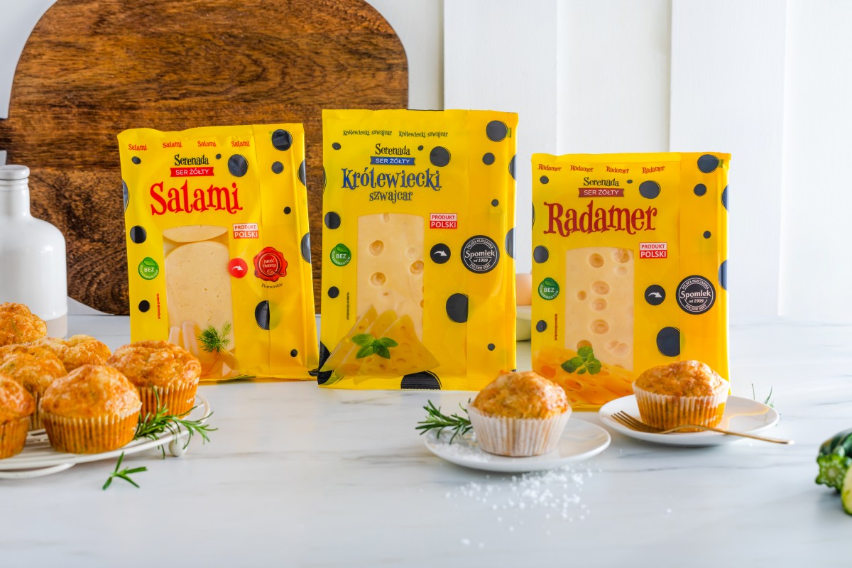 A Poland-first cheese brand that covers all most popular cheese types manufactured at Spomlek: Radamer, Radamer Wędzony, Szwajcar Królewiecki, Babumi, Salami,  Ser Mleczny, Gouda. Cheese aficionados must also try the Salami cheeses with spices, including garlic, and herbs, among them tomato with basil and chilli with pepper combinations. Serenada strikes you on the store shelf with its original yellow packaging with black “eyes.” It can be savoured alone as delicious snack or as a component of even the most exquisite dishes.